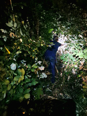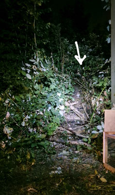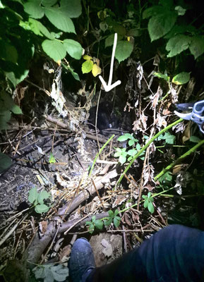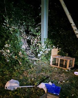 Zu zweit, versuchten unsere Kollegin und Diana Turnsek, die uns mit ihrem tatkräftigen Einsatz unterstütze, die kleine Maus zu sichern. Aber diese nahm anscheinend noch einmal alle verbliebene Kraft zusammen und ihre Beine in die Hand, um uns auszutricksen und in der Brombeerhecke am Bahndamm hinter uns zu verschwinden. In der Hoffnung, der Hunger würde die dürre Mieze in die Falle treiben, positionierten wir uns mit der Ziehfalle vor der Wand aus Dornen und Gestrüpp. Aber: keine Chance. Auch nach über einer Stunde zeigte das Tierchen kein Interesse an dem angebotenen Leckerbissen. Es mussten härtere Geschütze aufgefahren werden.